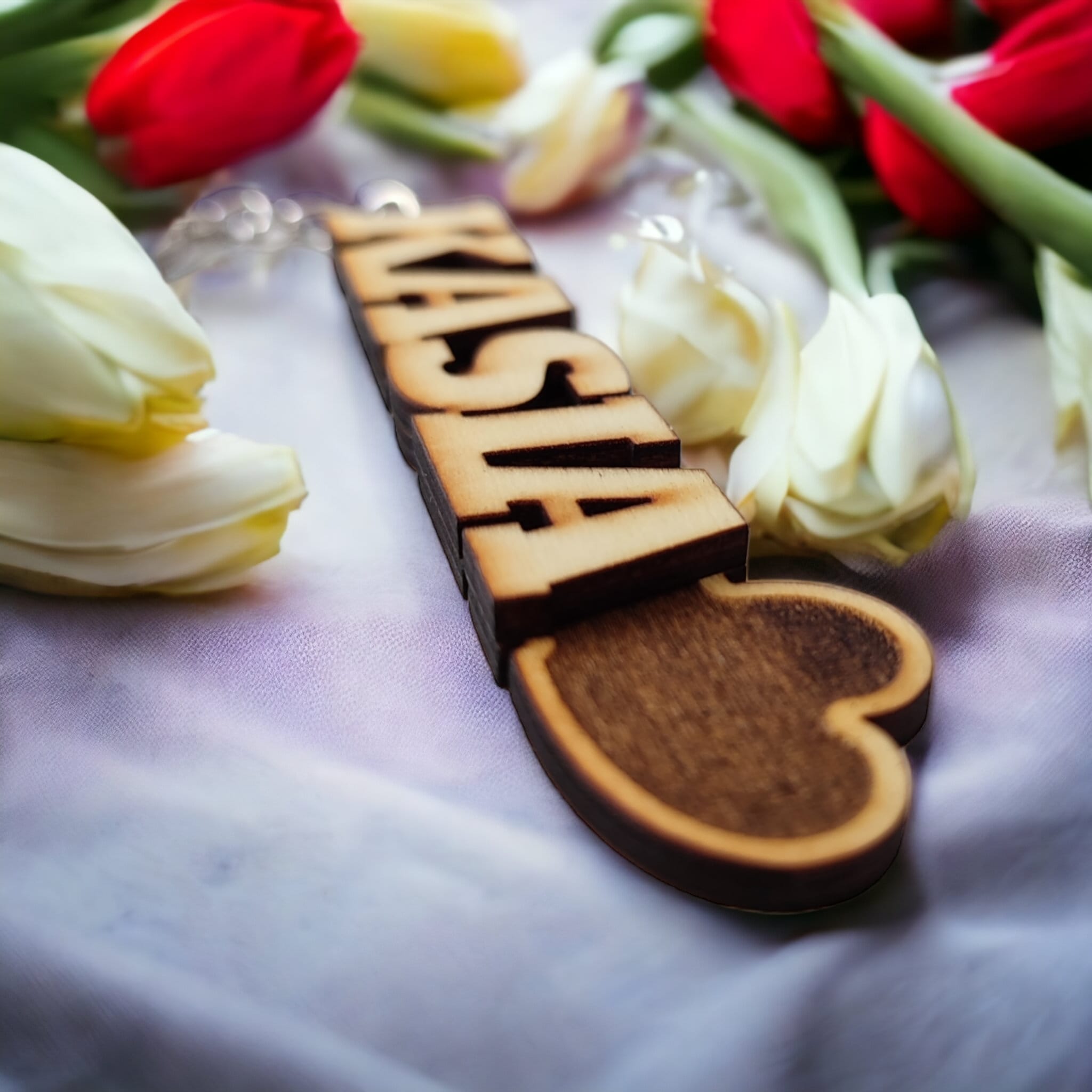 Brelok 3D z dowolnym imieniem i sercem na końcu. Łączony z dwóch sklejek 3 mm dla uzyskania efektu 3D. Długość breloka uzależniona od długości imienia. Podana długość dla imienia KASIA.