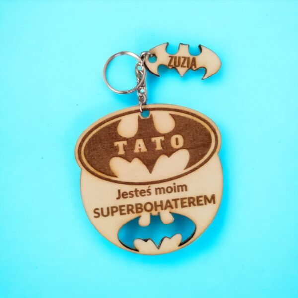 Brelok ze znakiem Batmana i napisem TATO jesteś min SUPERBOHATEREM oraz imieniem Dziecka na mniejszym znaku Batmana, utworzony ze sklejki 3 mm