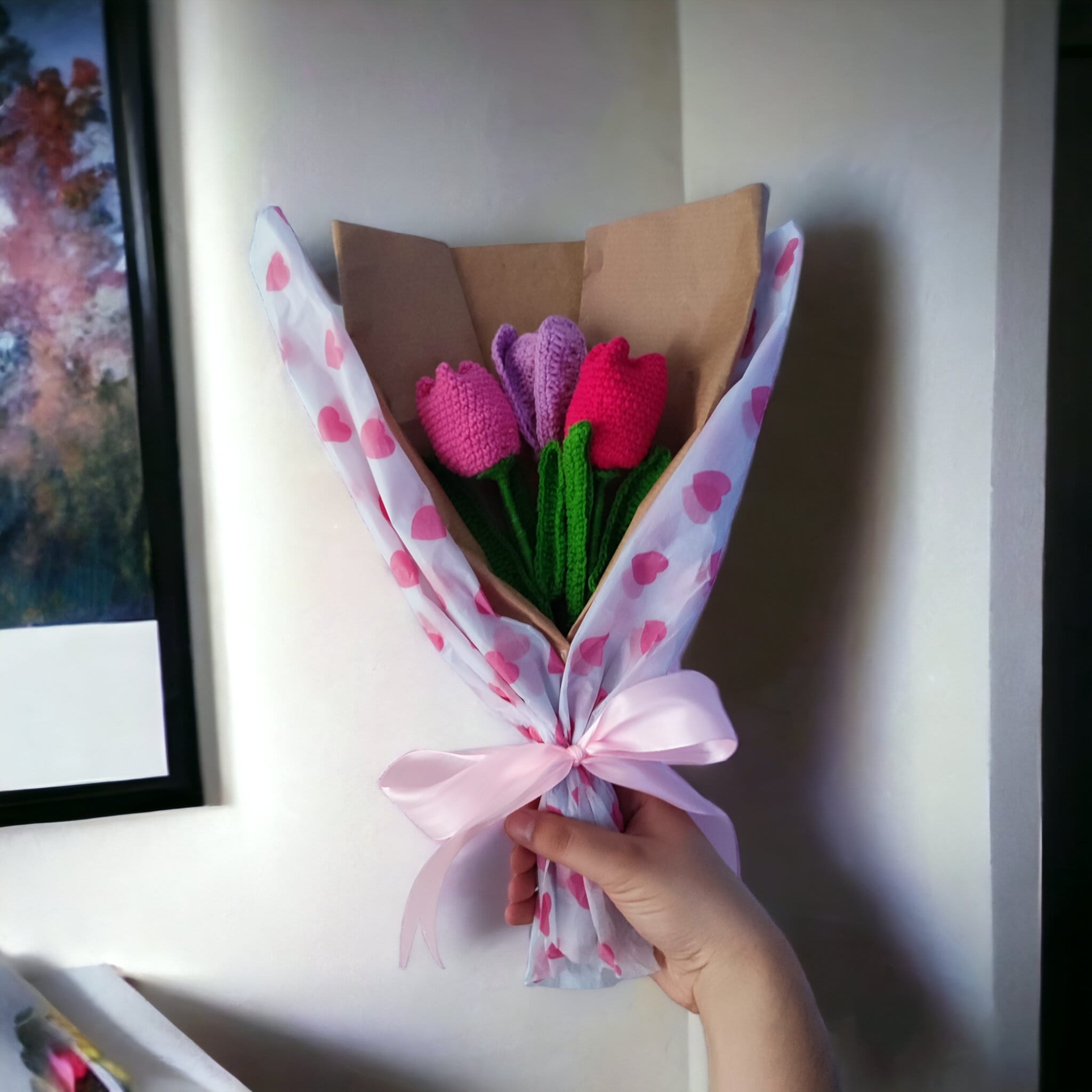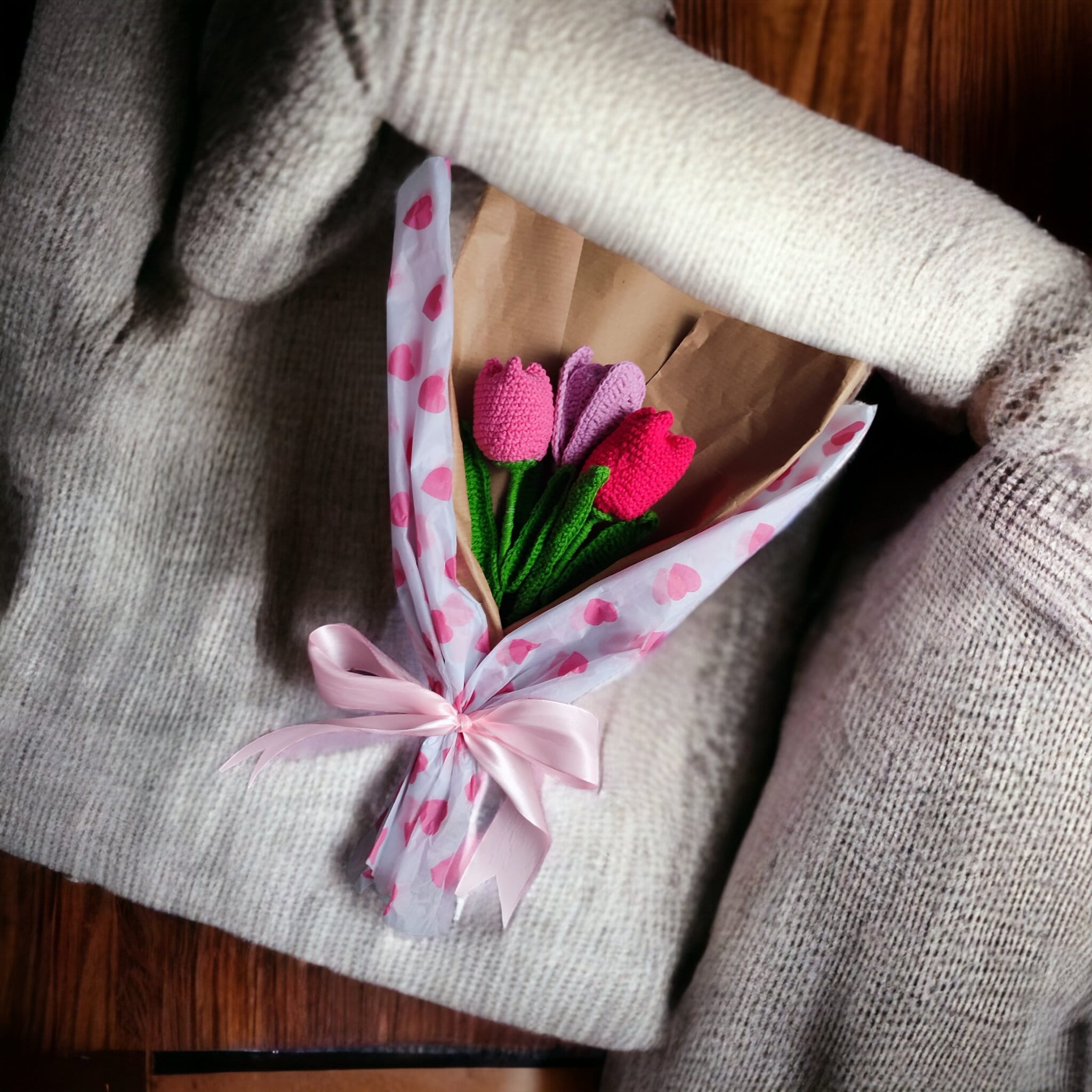 Bukiet składający się z trzech tulipanów w odcieniach różu, wykonane z włóczki na szydełku i wypchane kulką silikonową