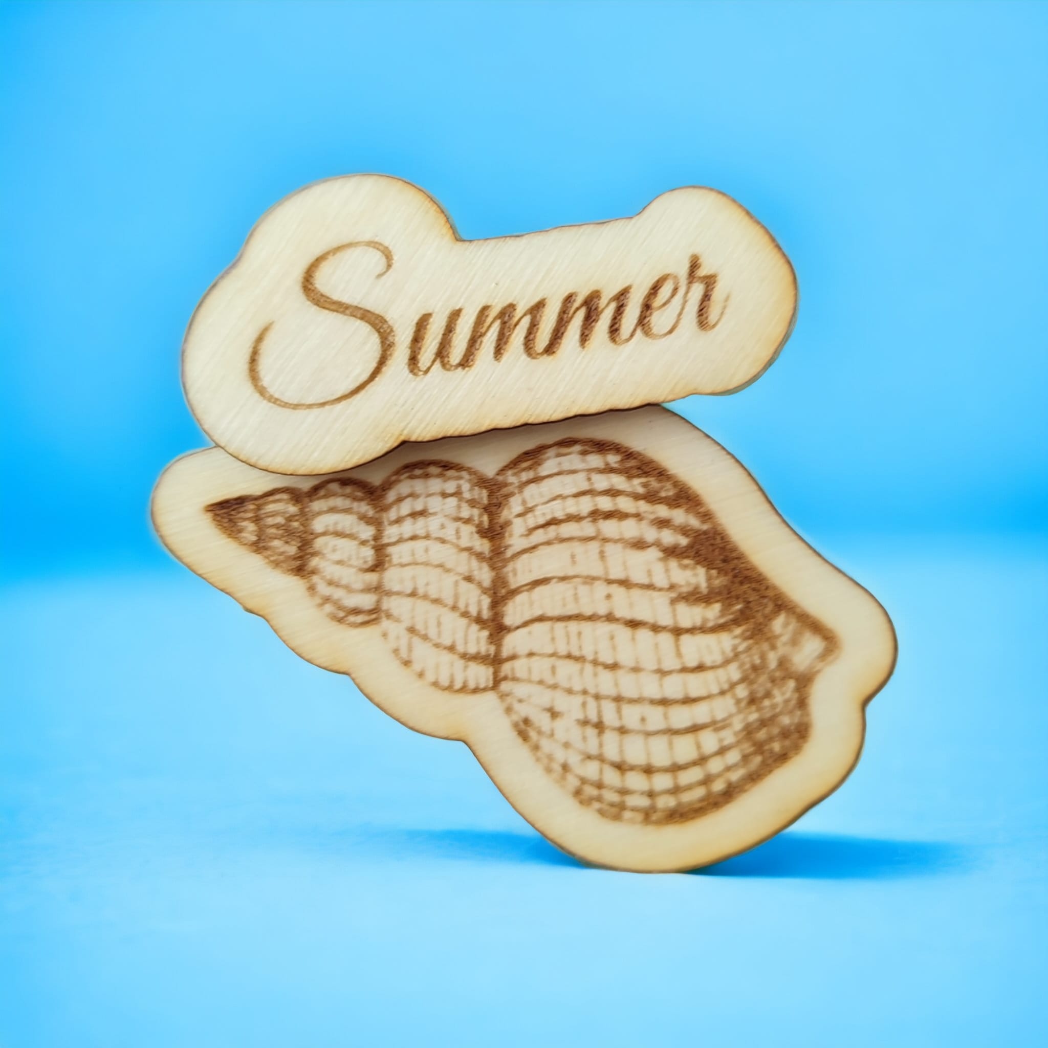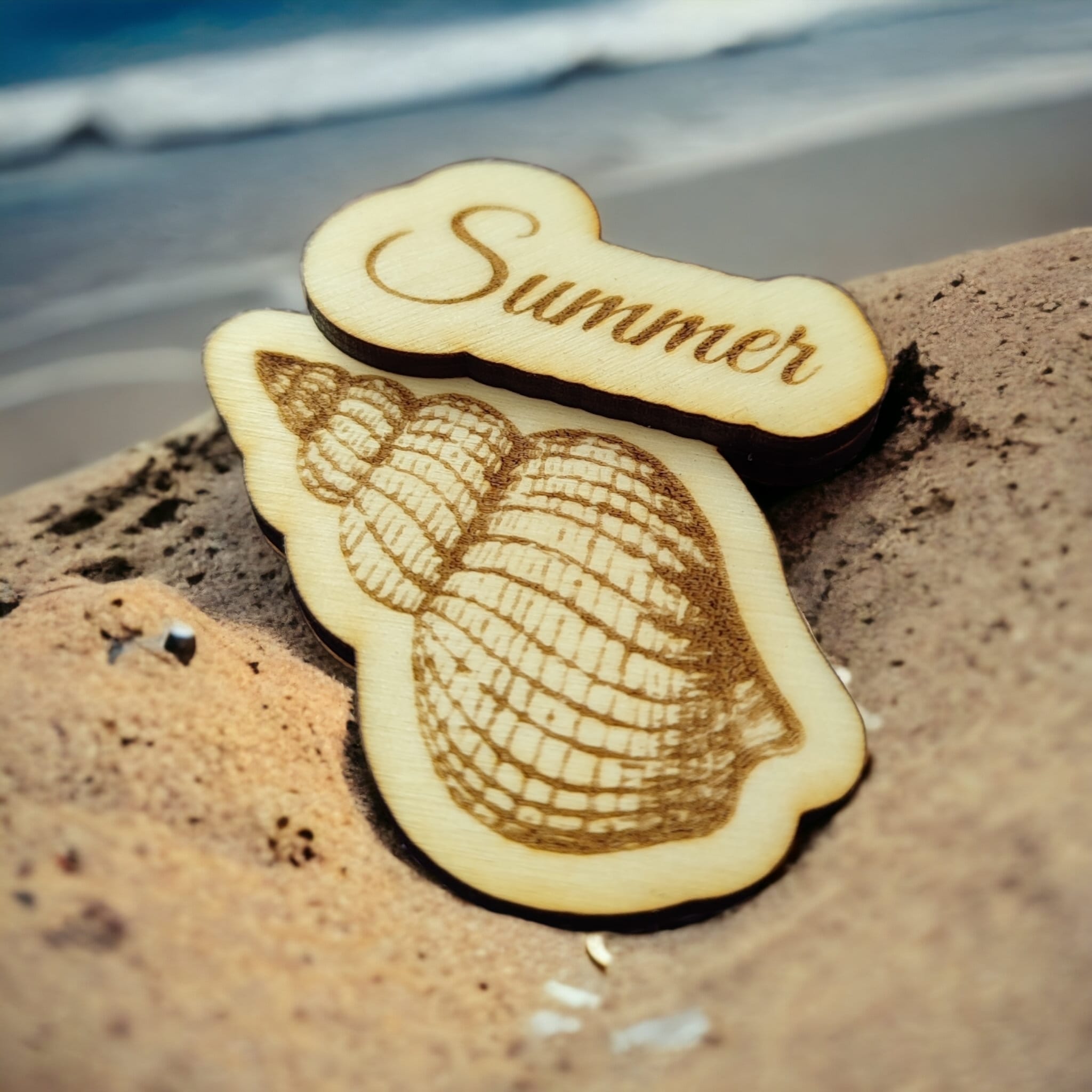 Magnes 3D z napisem i muszlą. Łączony z trzech sklejek 3 mm dla uzyskania efektu 3D. Trzecia warstwa sklejki to ramka dla magnesu. Wymiary magnesu uzależnione od długości napisu. Możliwość zmiany napisu. Podane wymiary dla napisu Summer.
