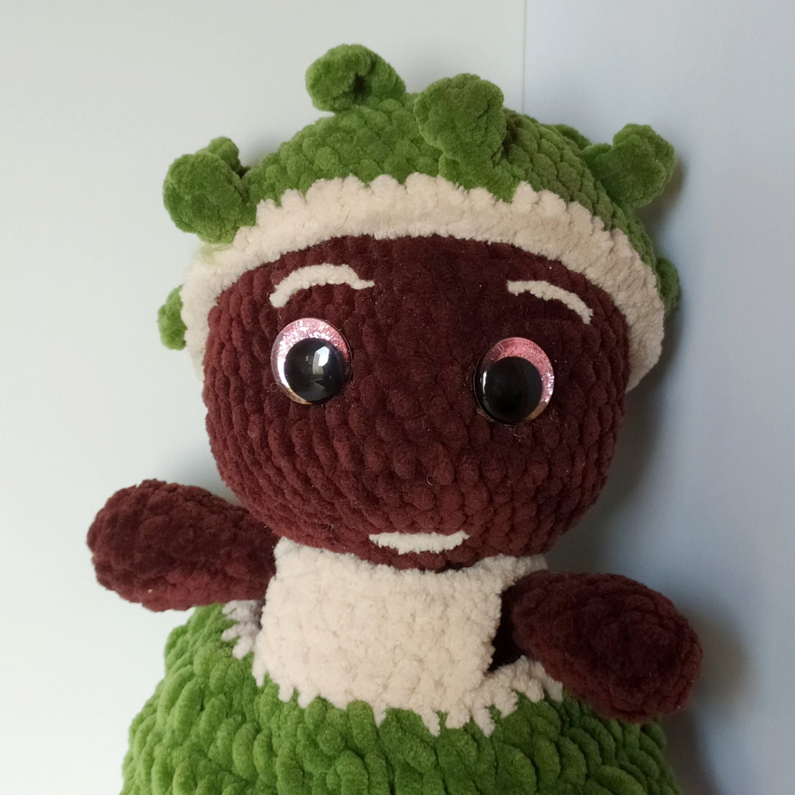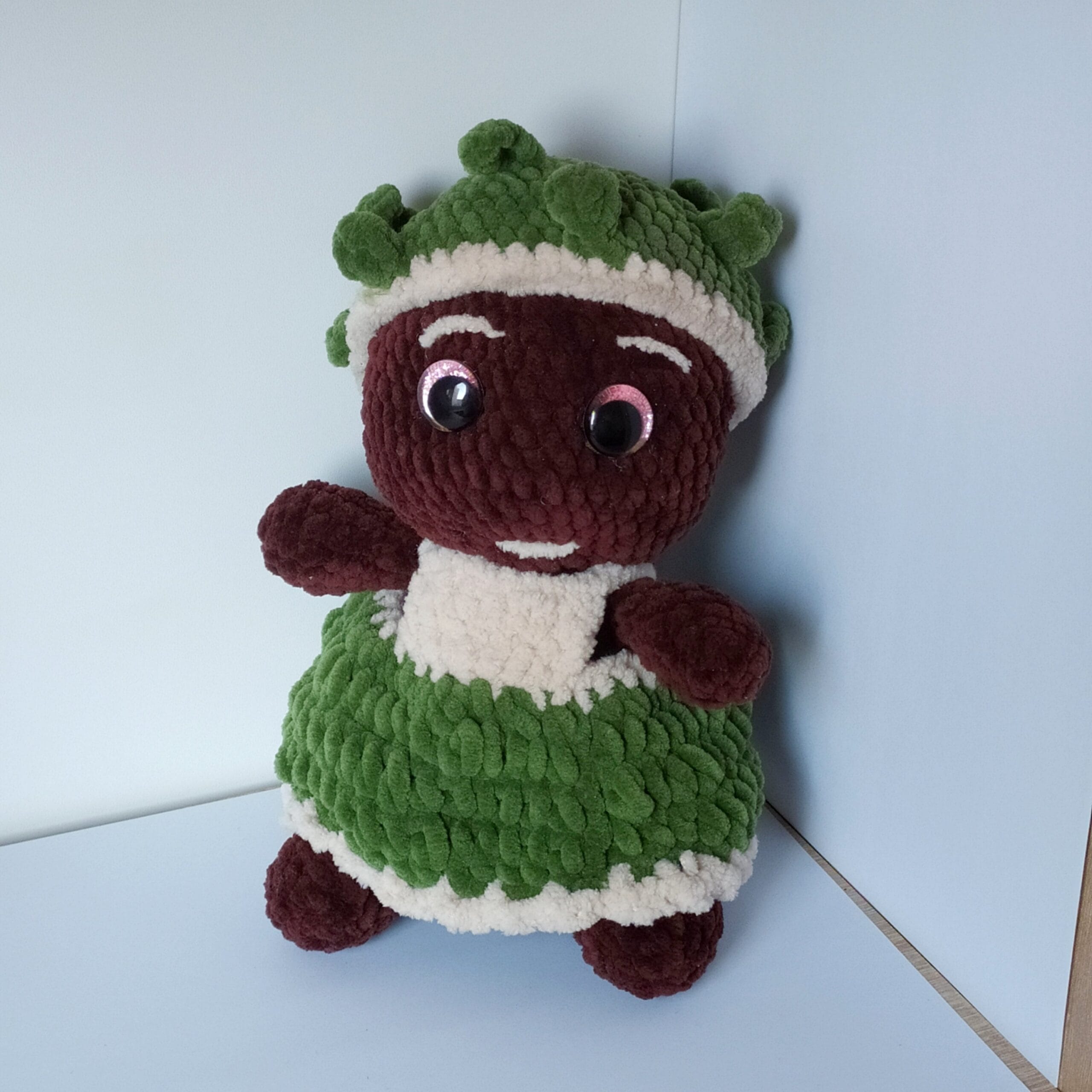 Kasztanka w sukience to ręcznie wykonana maskotka na szydełku z miękkiej włóczki pluszowej. Jej zielona sukienka dodaje uroku, czyniąc ją idealnym prezentem dla każdego.