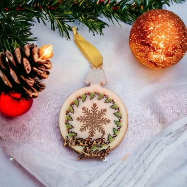 Na jednej z warstw sklejki znajduje się wycięty napis “Wesołych Świąt”, który dodaje uroku tej bombce i nadaje jej świąteczny charakter. Napis jest starannie wycięty, co nadaje bombce delikatność i elegancję.