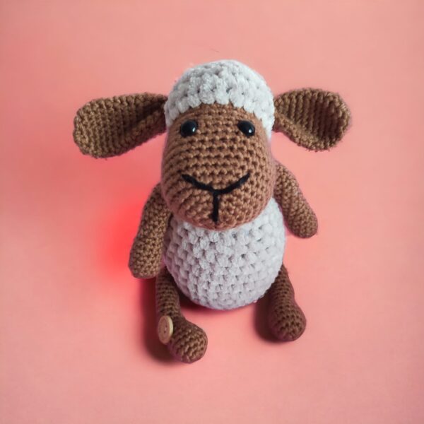 Maskotka owca brązowa wykonana jest z pluszowej włóczki atestowanej Himalaya Dolphin Baby – posiada certyfikat zgodności “Oeko-Tex Standard 100” oraz z włóczki YarnArt Jeans. Ma bezpieczne oczy zaciskowe